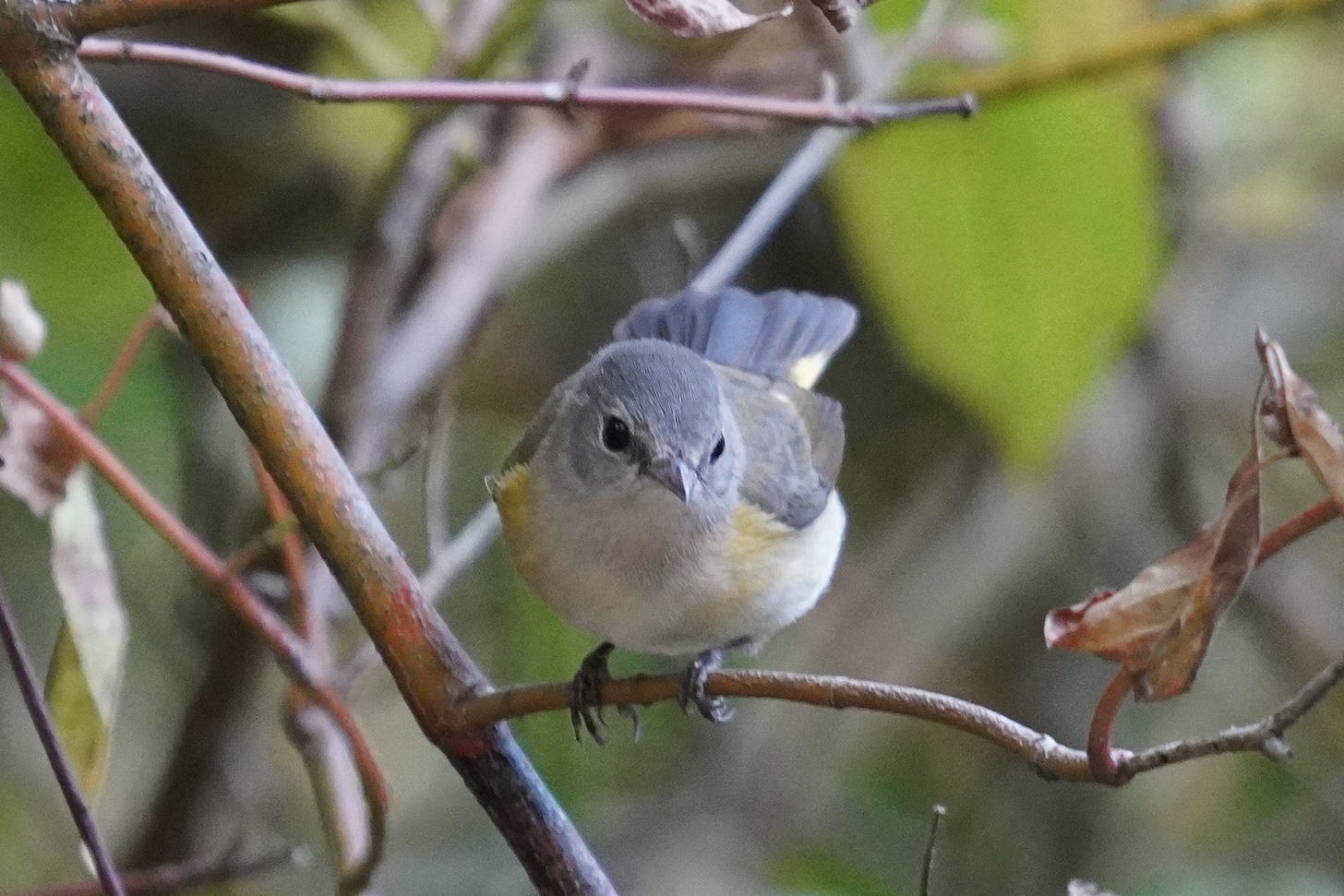 Later that day I returned with a totally different vibe. My listing switch was off. Instead, I was getting my steps and taking my time with the few warblers I encountered. I was stopping to get photos when the birds would humor me, like this immature female American Redstart, the furthest thing from a rarity but a delight to pass the time with nonetheless.
